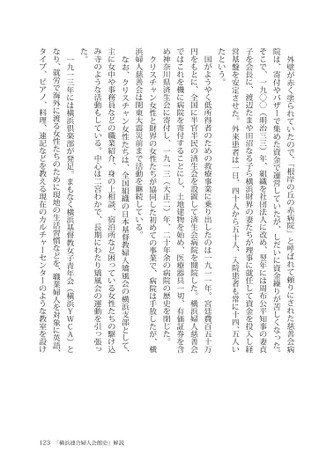 外壁が赤く塗られていたので、「根岸の丘の赤病院」と呼ばれて頼りにされた慈善会病院は、寄付やバザーで集めた資金で運営していたが、しだいに資金繰りが苦しくなった。そこで、一九〇〇(明治三三)年、組織を社団法人に改め、翌年には周布公平知事の妻貞子を会長に、渡辺たまや田沼なる子ら横浜財界の妻たちが理事に就任して資金を投入し経営基盤を安定させた。外来患者は一日、四十人から五十人、入院患者も常に十四、五人いたという。国がようやく低所得者のための救療事業に乗り出したのは一九一一年。宮廷費百五十万円をもとに、全国に半官半民の済生会を設置して済生会病院を開院した。横浜婦人慈善会ではこれを機に病院を寄付することにし、土地建物を始め、医療器具一切、有価証券を含め神奈川県済生会に寄付し、一九一三(大正二)年、二十年余の病院の歴史を閉じた。クリスチャン女性と財界の女性たちが協同した初めての事業で、病院は手放したが、横浜婦人慈善会は関東大震災前まで活動を継続している。なお、クリスチャン女性たちは、全国組織の日本基督教婦人矯風会の横浜支部として、主に女中や事務員などの職業紹介、身の上相談、宿泊所など困っている女性たちの駆け込み寺のような活動もしている。中心は二宮わかで、長期にわたり矯風会の運動を引っ張った。一九一三年には横浜倶楽部が発足。まもなく横浜基督教女子青年会(横浜YWCA)となり、就労で海外に渡る女性たちのために現地の生活習慣などを、職業婦人を対象に英語、タイプ、ピアノ、料理、速記などを教える現在のカルチャーセンターのような教室を設け123「横浜連合婦人会館史」解説