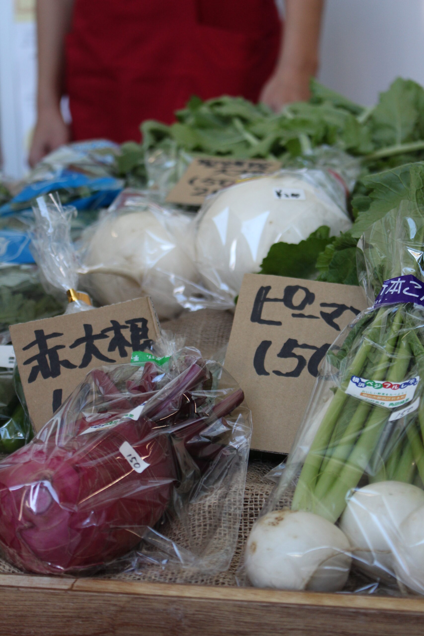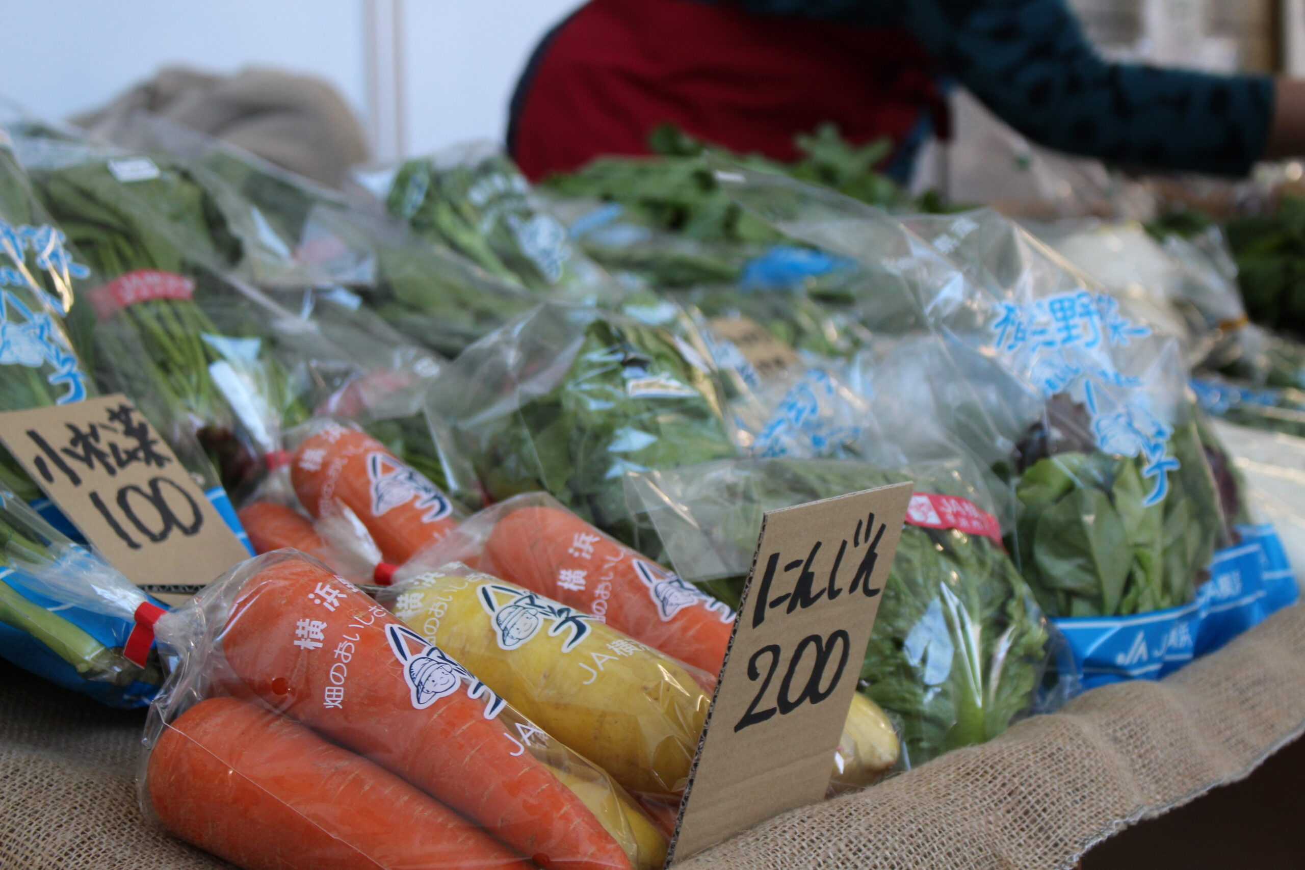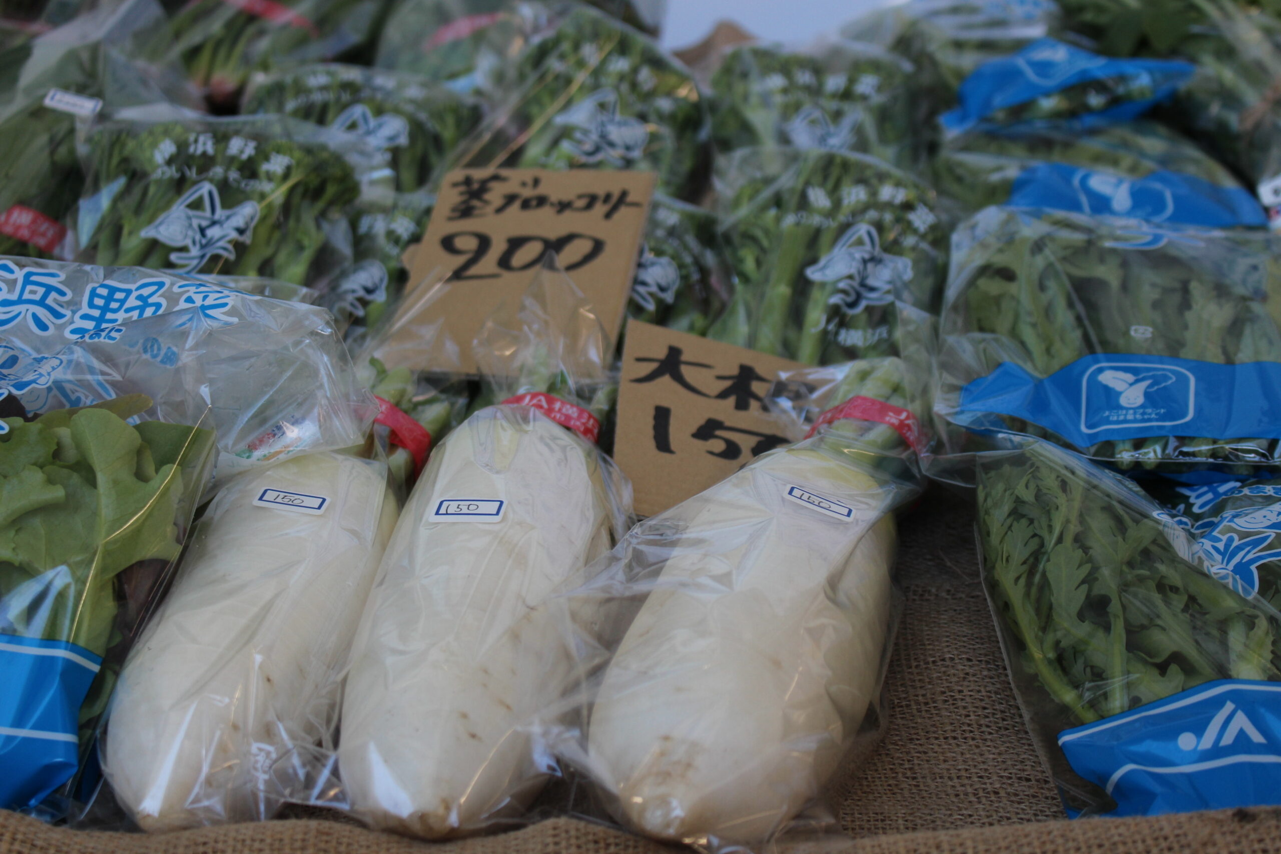 当日の販売品目:小松菜、ほうれん草、大根、人参、ブロッコリー、白菜、里芋、春菊、サツマイモ、ジャガイモ など(天候や状況などにより変更の可能性あり)
