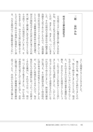 三題益田みね明治天皇御治績展覧会日光展で大きい収穫を得た嬉しさを忘れかね、何かなと私共は耳をそばだてていましたが、来ました、来ました、ついに来ました。それは明治天皇御在位中の顕著な御治績を人形であらわしたもので、北海道御巡幸の折は雪中でアイヌが土下座しているところや、日露戦争勃興直前の御前会議や、国会の開院式やまた岩倉公家行事で公の病床へ親しく御見舞いあそばされるところ等々全部で二十五の場景がございました。それをまず小学、中学の生徒に拝観させようと言う目的で県の学務部に後援をして頂き、大なる期待の下に興産館を借り入れいよいよ開催することとなりました。幾日かの後、飾りつけも終わりましたので、皆と下検分をしましたところが、残念ながら失望しないではいられませんでした。それはさきの日光展の豪華な構想に引換え、またなんとした貧弱さでしたでしょう。これではまことに恐れ多いことと思いまして非常に当惑致しました。しかしこれは今少しなんとかして意義あるものにしなければならぬと存じまして、野村様の御意見に基づき、その御指図を頂いて明治時代に因む参考品を収集することとしましたが、なにぶん時間がありませんので、毎日集めたものを開館前に持って行って位置よくそれを陳列し、それが今日は一つ、明日は二つと増えて集まりました。中にも時の学務部長九鬼さんがこの催しに対し、非常に御共鳴下さいまして御秘蔵の錦絵を御出品下さったり、出品のものを写真に撮られ横浜連合婦人会館史100年のバトンを受けとる66