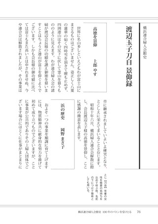 横浜連合婦人会館史100年のバトンを受けとる76渡辺玉子刀自景仰録高徳を景仰上郎やす世界に名山多しといえどもわが富士山にまさるものはございません。姿正しく八葉の蓮華の如く四時雪を頂きて塵も止めず、四囲連山はその足下に伏して霊山を慕うもののように見えます。わが連合婦人会の諸婦が渡辺会長様の功績を讃え御徳を慕いますことはちょうど連山が富士を仰ぐようでございます。しかも会長様の御功績に比べては富士もまた高いとは申されませぬ。今や連合会は解散されましたが、その事業は市に継承されましていよいよ確実となり、とこしえに栄えてまいることと存じます。昭和十年六月、横浜婦人連合会解散に際し、会長渡辺玉子様の高徳を景仰し、ここに感謝の微意を表します。とじ【刀自】年輩の女性を敬愛の気持ちを込めて呼ぶ称。名前の下につけて敬称としても用いる。浜の歴史岡野まさ子およそ一つの事業を順調に育て上げますには、物質精神共に献身的な努力を捧げて初めて成り立つものでございますが、ことに事業が公共的でありその上婦人団体でございます場合にはとくに仕事がまとまりに