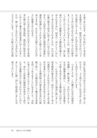 き妻であられます。外に平和にして善良なる家風をつくり、敬祖の実を示されつつ子女の教育に尽くされ、それぞれ有用の人材として世に送り出され主婦としての任務をまっとうしておられますことは、皆様のよくご存じのことでございましょう。常に家庭の人として模範をすべき御性格を備えておられます外に、国家の一員としていかによく奉公の実を示されましたか。かの日清日露の戦争当時実に涙ぐましいほどの努力をもって出征兵士の慰問に義捐金の募集に遺族の救護に尽くされました数々のことを承ります時、ひたすらその雄々しさけなげさに感激させられます。さらに女史におかせられましては生来慈善の御心深く慈善病院、孤児院の経営をはじめとして幾多の慈善事業に尽くされましたか、数へ挙ぐるだけでもいとまがないほどでございます。こうした数々の善行美徳は常に私共が目のあたりで学ばして頂くだけでなく、子々孫々にもこれを学ばしめたいとねがうのでございます。つきましては、この機会に女史の頌徳会を組織し一般に募金し、それによりまして女史の胸像を建設し、一にはかかる尊敬すべき婦人を有することを横浜婦人の誇りとし、一には永久に女史の風姿に接しまして質実勤勉の徳を学び一国民としてよく奉公の義務をつくされ社会人としてあらゆる慈善の事業に心をくだき奉仕を色々せられましたことを横浜婦人の徳を進むる実行の模範と致し、この横浜市をして健全なる家庭を持っておりますことにおきまして、全国に秀でたる都市とならしめたいと思います。希わくは皆様の御賛同を得まして直ちにその運動の実行に取りかかりたいと存じましてここに御一同にご相談致しました次第でございます。91渡辺玉子刀自景仰録
