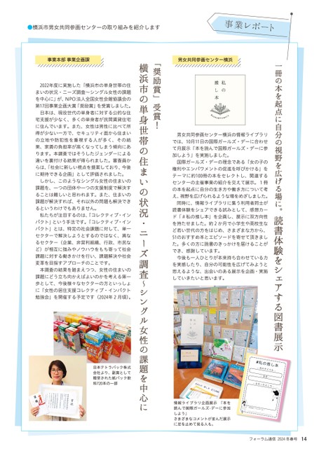 一冊の本を起点に自分の視野を広げる場に。読書体験をシェアする図書展示男女共同参画センター横浜男女共同参画センター横浜の情報ライブラリでは、10月11日の国際ガールズ・デーに合わせて月展示「本を読んで国際ガールズ・デーに参加しよう」を実施しました。国際ガールズ・デーの理念である「女の子の権利やエンパワメントの促進を呼びかける」をテーマに約100冊の本をセレクトし、関連するセンターの主催事業の紹介を交えて展示。1冊の本を起点に自分の生き方や働き方について考え、視野を広げられるような場をめざしました。同時に、情報ライブラリに集う利用者同士が読書体験をシェアできる試みとして、感想カード「#私の推し本」を企画し、展示に双方向性を持たせました。約2か月で小学生や高校生など若い世代の方をはじめ、さまざまな方から、51のおすすめ本とエピソードを寄せて頂きました。多くの方に読書のきっかけを届けることができ、感謝しています。今後も一人ひとりが本来持ち合わせている力を実感したり、自分の可能性を広げてみようと思えるような、出会いのある展示を企画・実施していきたいと思います。情報ライブラリ企画展示「本を読んで国際ガールズ·デーに参加しよう」さまざまなコメントが並んだ展示に足を止めて見る人も。フォーラム通信2024冬春号14「奨励賞」受賞!横浜市の単身世帯の住まいの状況・ニーズ調査〜シングル女性の課題を中心にまい事業本部事業企画課2022年度に実施した「横浜市の単身世帯の住まいの状況・ニーズ調査〜シングル女性の課題を中心に」が、NPO法人全国女性会館協議会の第17回事業企画大賞「奨励賞」を受賞しました。日本は、現役世代の単身者に対する公的な住宅支援が少なく、多くの単身者が民間賃貸住宅に住んでいます。また、女性は男性に比べて所得が少ない一方で、セキュリティ面から住まいの立地や防犯性を重視する人が多く、その結果、家賃の負担率が高くなってしまう傾向にあります。本調査ではそうしたジェンダーによる違いを裏付ける結果が得られました。審査員からは、「社会に新しい視点を提案しており、今後に期待できる企画」として評価されました。しかし、このようなシングル女性の住まいの課題を、一つの団体や一つの支援制度で解決することは難しいと思われます。また、住まいの課題が解決すれば、それ以外の問題も解決できるというわけでもありません。私たちが注目するのは、「コレクティブ・インパクト」という手法です。「コレクティブ・インパクト」とは、特定の社会課題に対して、単一セクターで解決しようとするのではなく、異なるセクター(企業、非営利組織、行政、市民など)が相互に強みやノウハウをもち寄って社会課題に対する働きかけを行い、課題解決や社会変革を目指すアプローチのことです。本調査の結果を踏まえつつ、女性の住まいの課題にどう立ち向かえばよいのかを考える第一歩として、今後様々なセクターの方といっしょに「女性の居住支援コレクティブ・インパクト勉強会」を開催する予定です(2024年2月頃)。日本テトラパック株式会社より、副賞として贈呈された紙パック飲料720本の一部●横浜市男女共同参画センターの取り組みを紹介します事業レポート