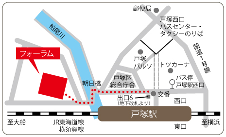 戸塚駅改札口を出て左に進み、出口6から出てください。線路に沿って道なりに進んでください。そのまま進むと、朝日橋に出ます。橋をわたって、線路沿いの道を進むと右手側にあるベージュ色の建物が、フォーラムです。