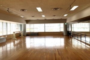 3面を窓に囲まれた広々とした開放的なスタジオです。床面積143㎡(17.7m×8.1m、高さ3.1m)。更衣室(ロッカー・シャワーあり)もあり、前面に大きな鏡を備えた、快適なフローリングスペースです。